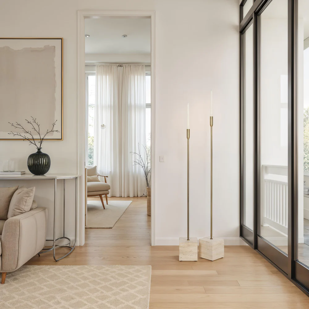 Create visual harmony in your chosen room with this striking duo of long and lean floor candle holders. Luxurious travertine and brushed brass come together to bring a touch of opulence to modern decorating schemes. Place them next to a fireplace or sofa with sleek taper candles for an added layer of cozy charm.
