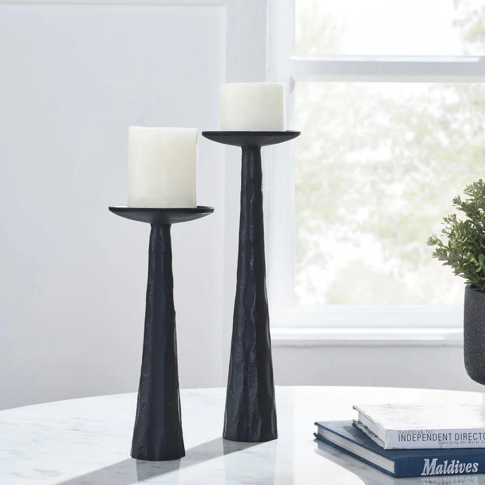 Gothic glamor envelops the stylish interior living space when these candle holders enter the space. With one pillar standing at 13 inches and the other 10, they complement one another and create greater dramatic impact through their differences. Composed of cast aluminum painted matte black, they are even more exquisite with glowing candles atop.