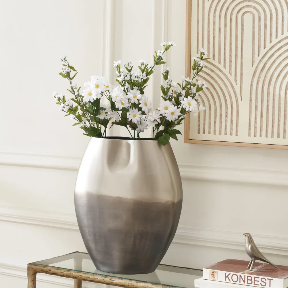 Add style and a handmade look to any contemporary interior with the curvaceous lines of this decorative vase. Treated to an ombre nicked-plated finish, its sleek coloring plays with light and shadow to create a point of interest in the room. As beautiful left empty as it is filled with branches, this is a piece you’ll reach for time and again.