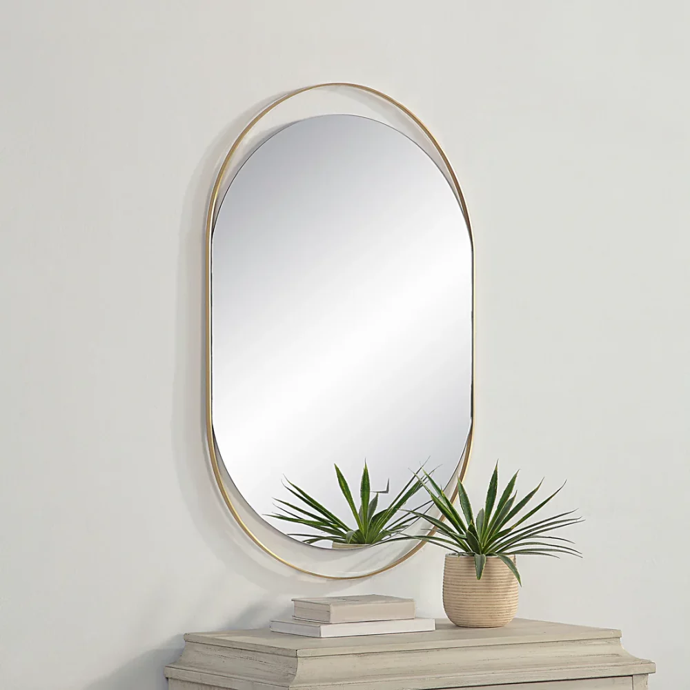 Transform any room with the elegant and stylish Ecru 40″ Tall Pill Oval Mirror. Made with high-quality materials, this mirror boasts a sturdy construction that will last for years to come. The mirror features an oval shape, and the frame has a sleek satin brass finish that adds a touch of luxury and sophistication to any space. With its tall design, the mirror is perfect for any room in your home, providing a full-length view that makes it easy to get ready each day. Whether it’s for your bedroom or living room, the Ecru Oval Mirror is the perfect addition to complete the look of any sophisticated space.