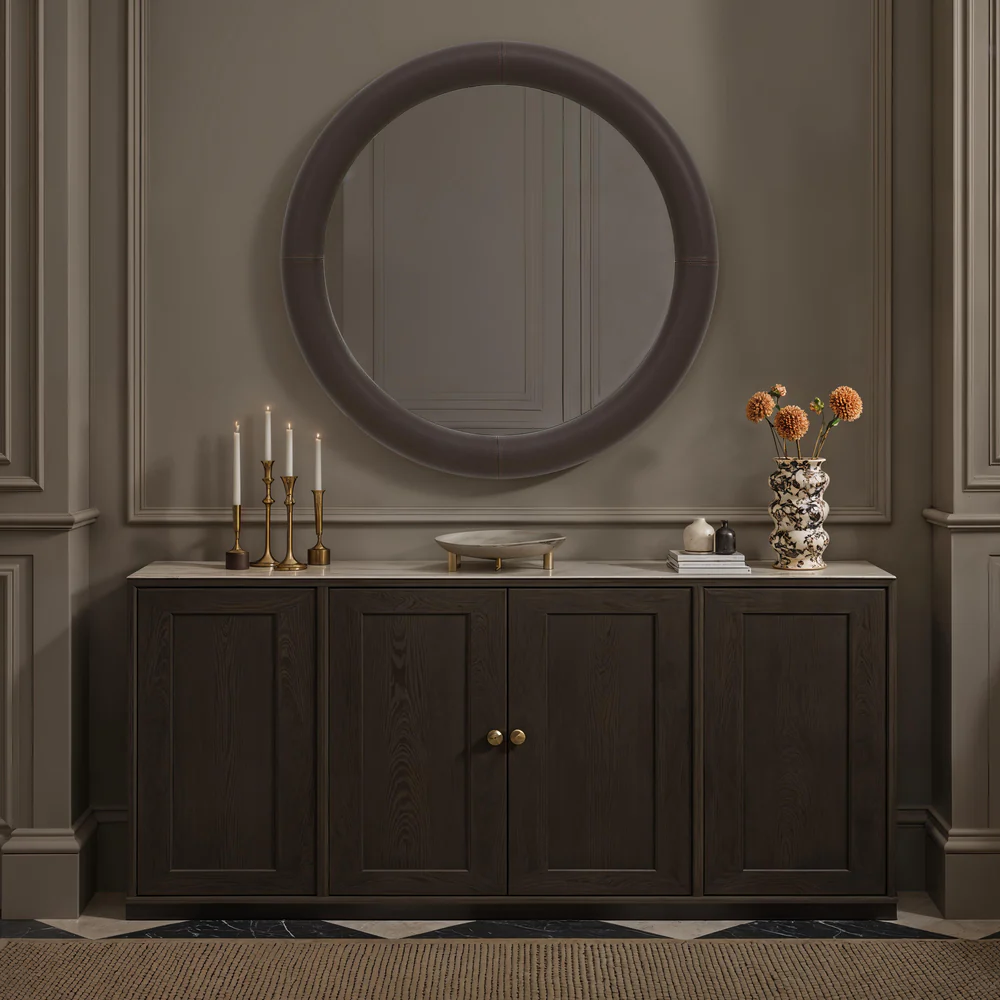 Bring elevated sophistication to any interior with the Porto decorative mirror. Its generous four-foot diameter and deep brown finish create an impressive focal point that instantly defines a room’s aesthetic. Wrapped in luxurious faux leather and paired with copper-free silvered glass, it offers a crisp, true reflection while adding a bold, contemporary statement to your design project.