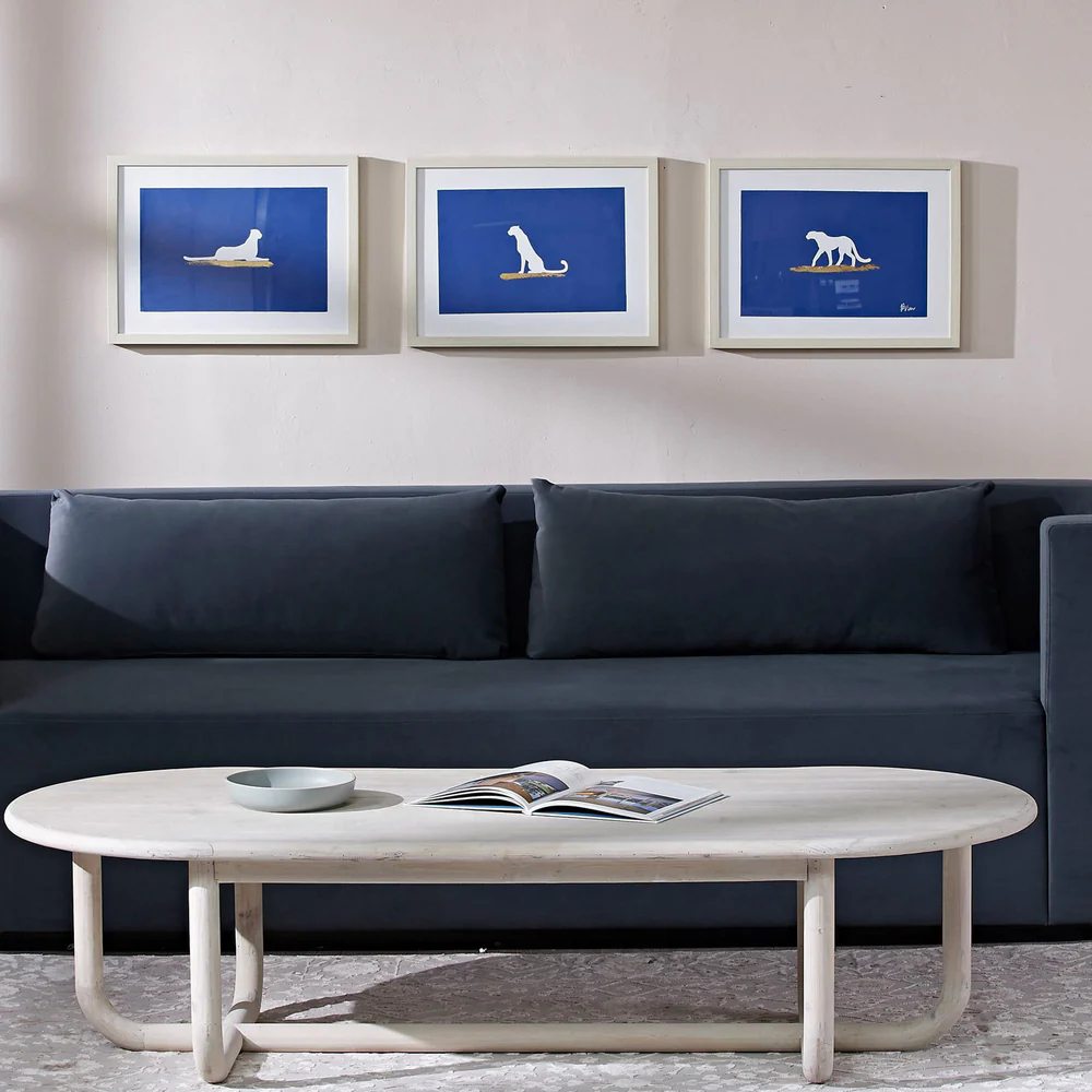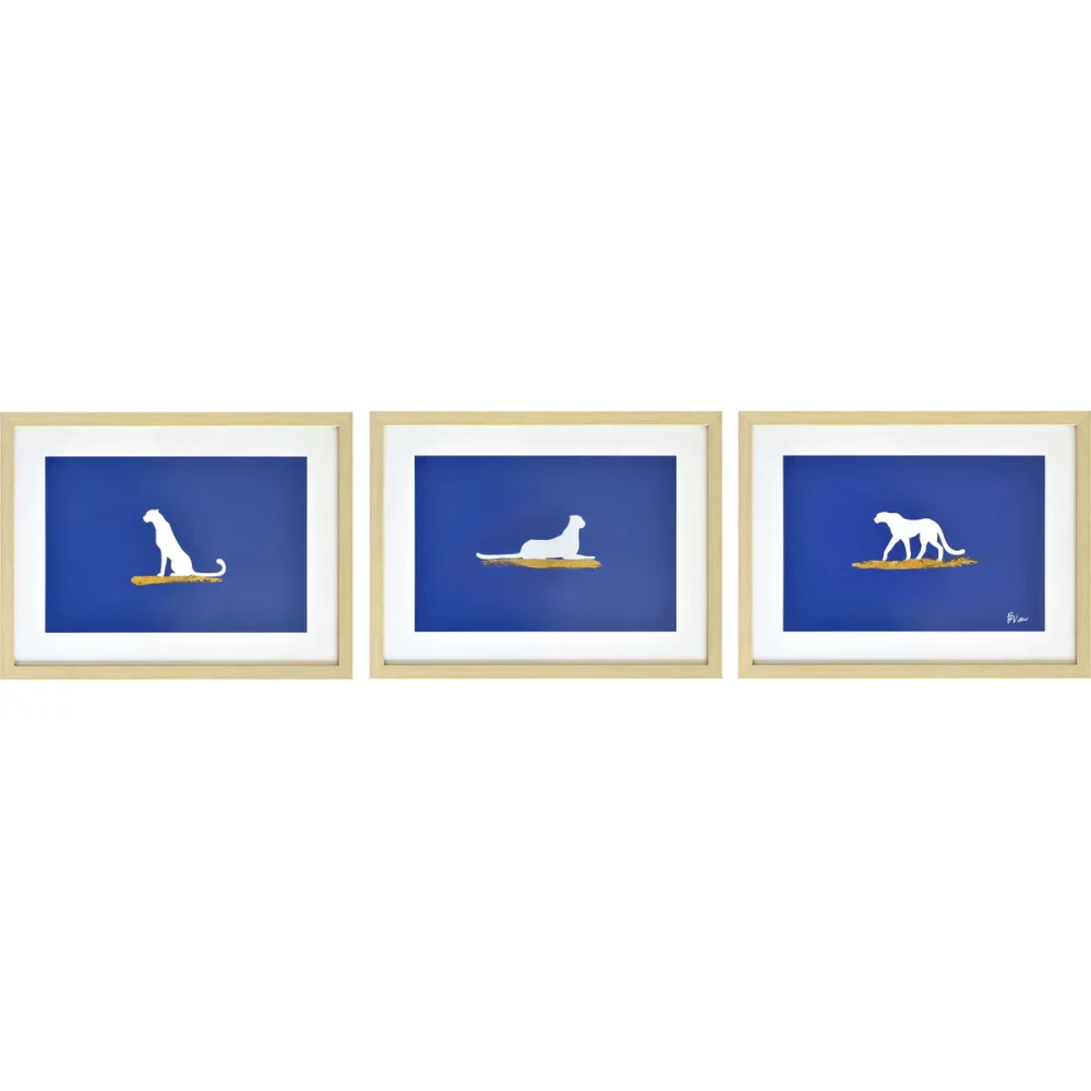 These three wall art pieces envelop the contemporary interior with the captivating beauty of a portrait. Set against rag paper, the royal blue backdrops carry undeniable charm to the space they are set within. Featuring three different outlines of a jungle cat, the mystique of the subject is felt even from a distance.