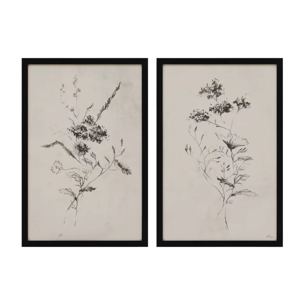 The Adeline duo reimagines botanical art with a contemporary edge. Each print, rendered on premium rag paper, captures intricate detail and subtle texture. Encased in minimalist black frames under glass, this pair introduces a fresh, modern take on nature-inspired design, adding sophistication and effortless style to any room.
